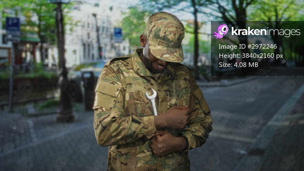 Soldier man clutching wrench to chest on a street wearing camouflage uniform and cap, holding wrench while smiling with head bowed; duty resilience.