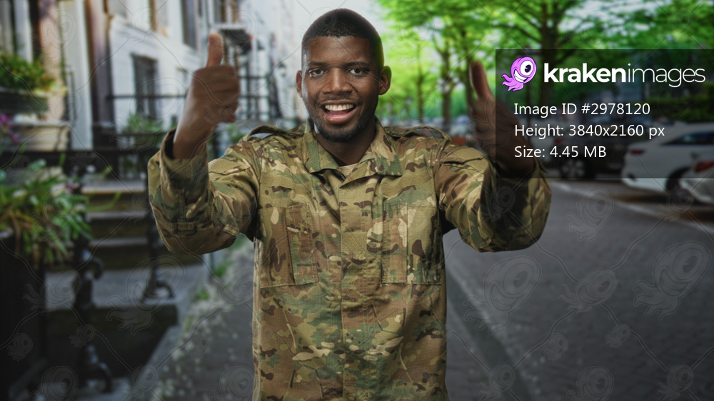 Soldier man giving thumbs up with visible hands in camouflage uniform standing on urban street with parked cars and trees; pride courage optimism.