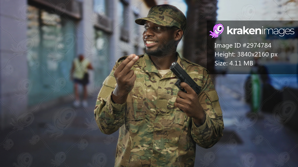 Soldier man holding handgun and making a pinched fingers gesture on a city street; confidence readiness.
