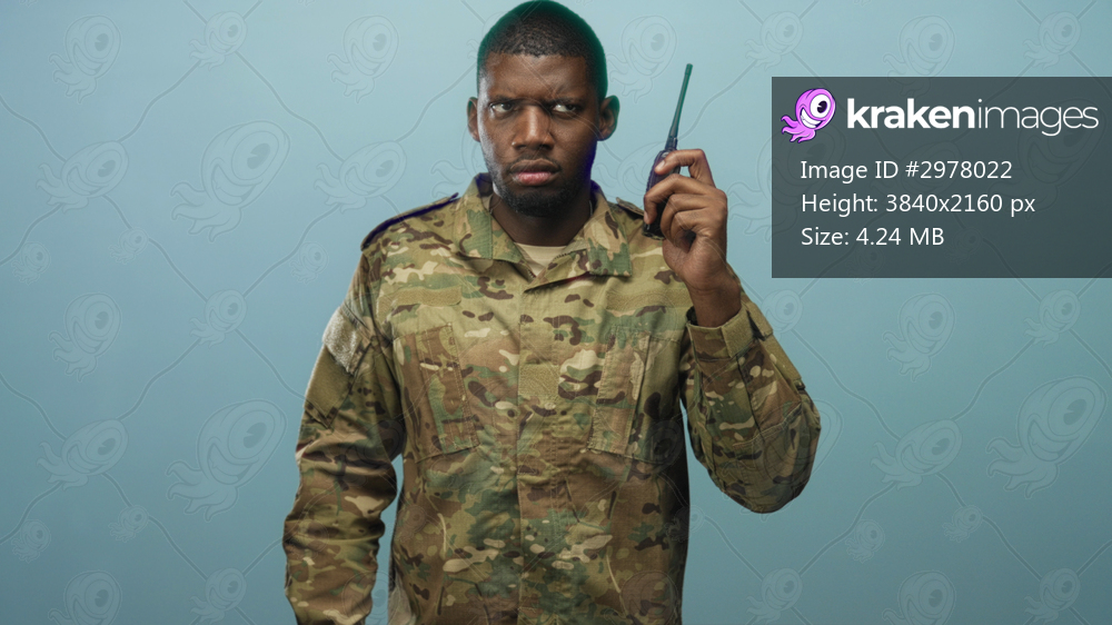 Soldier man holding radio to ear with hand in studio, camouflage uniform visible and serious expression; alertness duty.