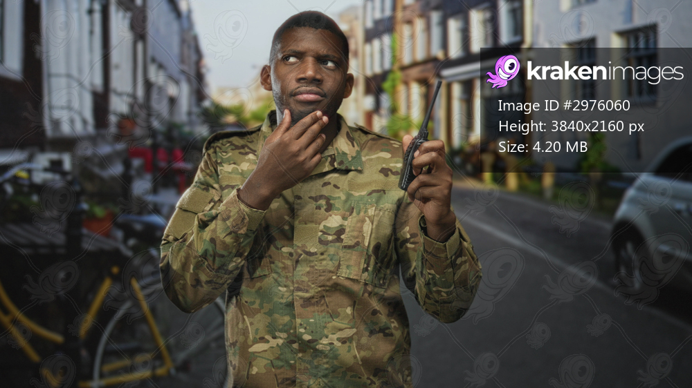 Soldier man in camouflage holds a radio, touches his chin and scans a narrow residential street with bicycle and parked car; thoughtful duty.