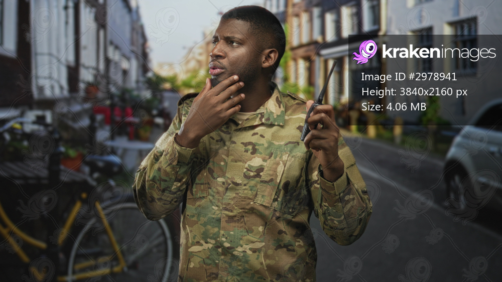 Soldier man in camouflage holds a radio, touches his chin and scans a narrow residential street with bicycle and parked car; thoughtful duty.