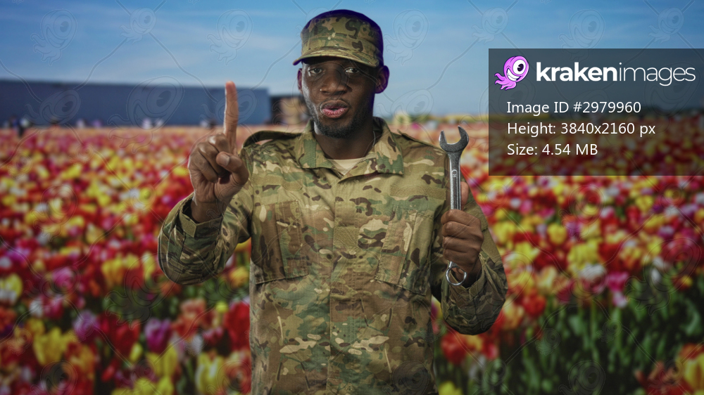 Soldier man in camouflage holds a wrench and shows two fingers peace sign with right hand near a building in a tulip field; pride duty.