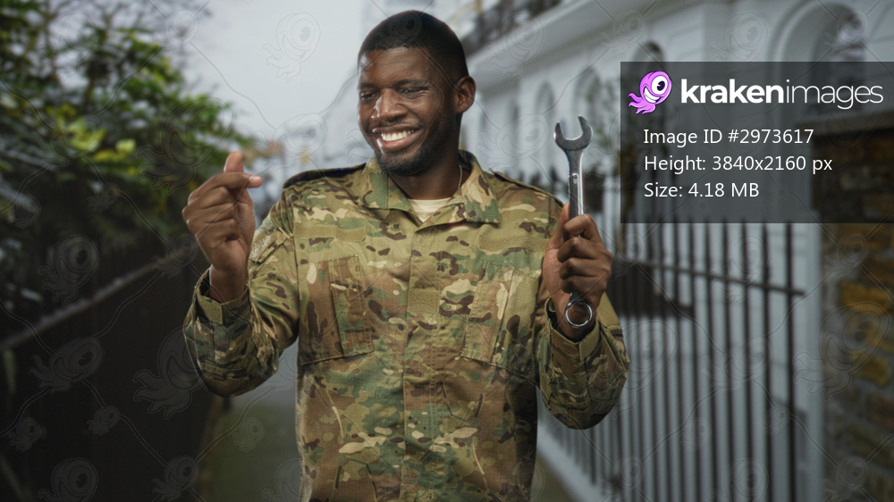Soldier man in camouflage holds wrench and makes finger heart gesture on street beside iron railings and townhouses; pride duty.