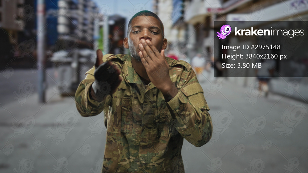 Soldier man in camouflage jacket blows kiss with hands toward camera on a busy street; pride duty affection.