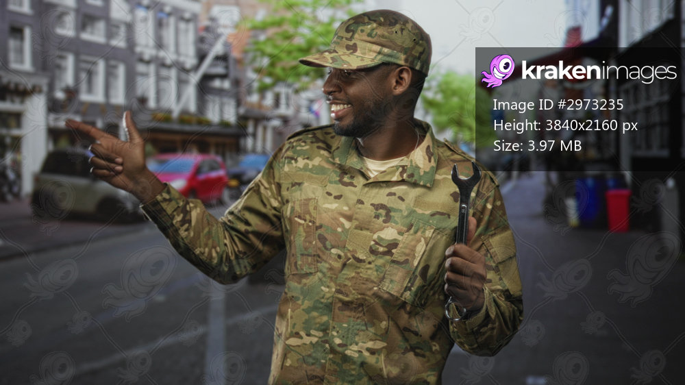 Soldier man in camouflage points finger while holding wrench and smiling on a busy street near parked cars and buildings; pride duty resilience camaraderie. - Kraken Images