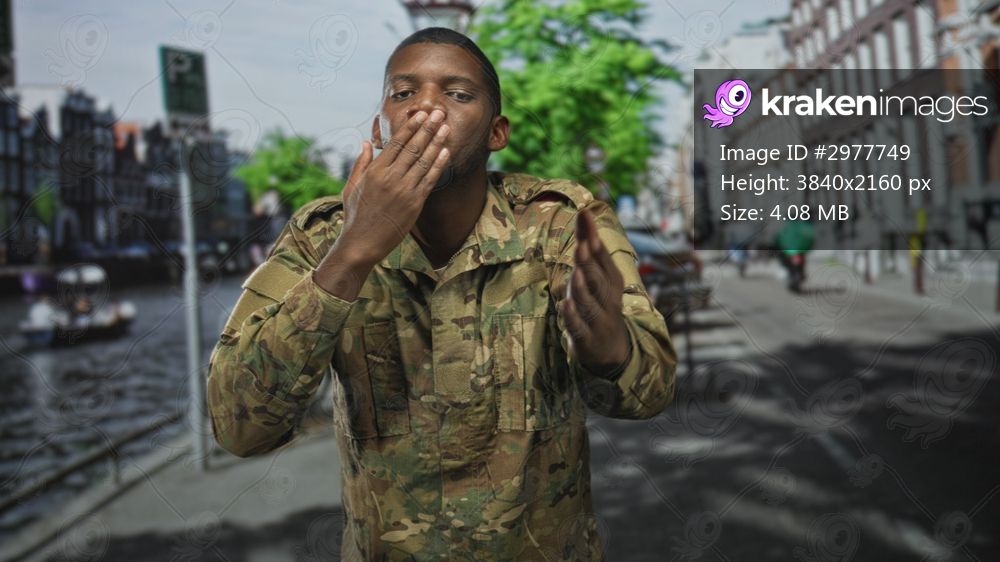 Soldier man in camouflage uniform blows a kiss with hands at mouth on a busy city street; farewell affection.