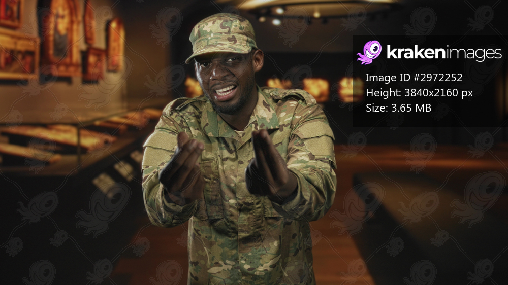 Soldier man in camouflage uniform extends palms forward in museum building with display cases and framed art; pride duty.