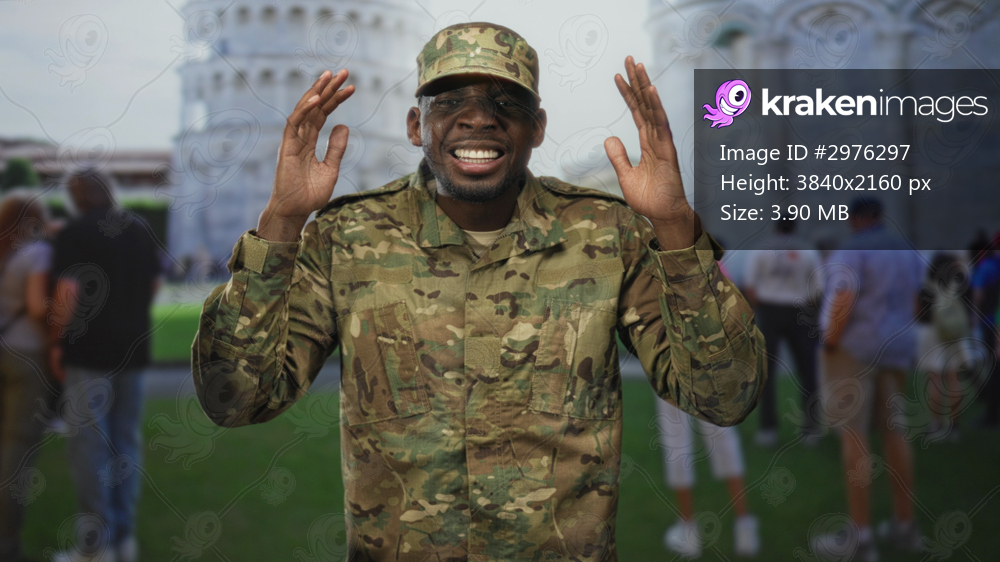 Soldier man in camouflage uniform with hands raised and smiling in front of building; pride duty service.