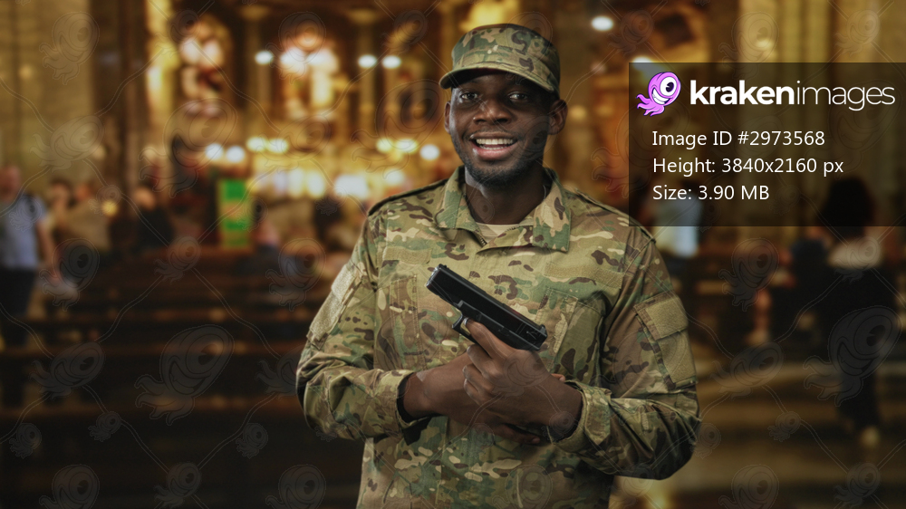 Soldier man in camouflage uniform holding a handgun across his chest inside an ornate building, smiling while steadying the grip; confidence duty.