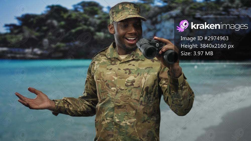 Soldier man in camouflage uniform holding binoculars, open right hand gesture toward sea backdrop in studio; duty pride.