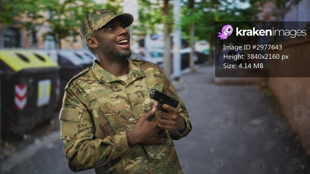 Soldier man in camouflage uniform holding pistol across chest, smiling and looking up amid trashbin and parked scooter on city street; pride duty.