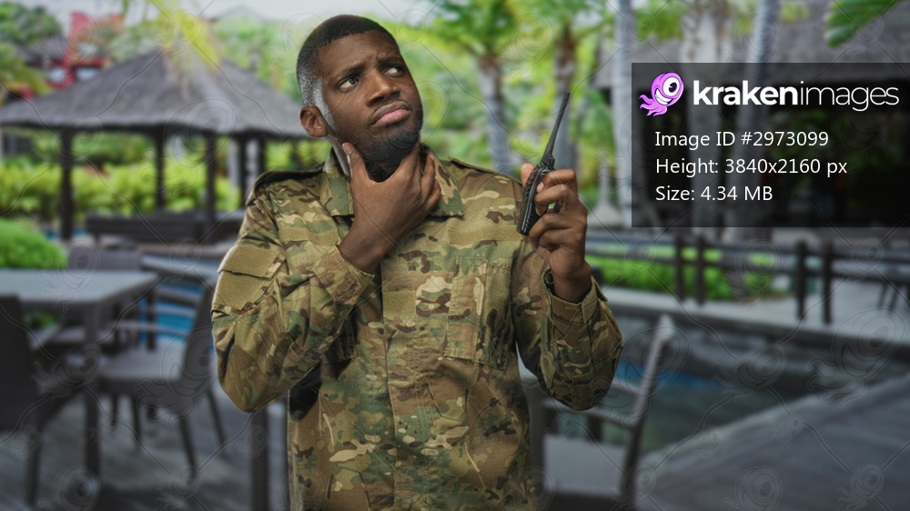 Soldier man in camouflage uniform holds walkie talkie and touches throat while standing near a poolside building with gazebo and chairs; uncertainty duty. - Kraken Images
