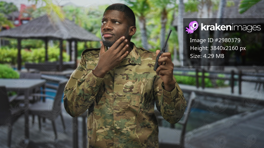 Soldier man in camouflage uniform holds walkie talkie and touches throat while standing near a poolside building with gazebo and chairs; uncertainty duty. - Kraken Images