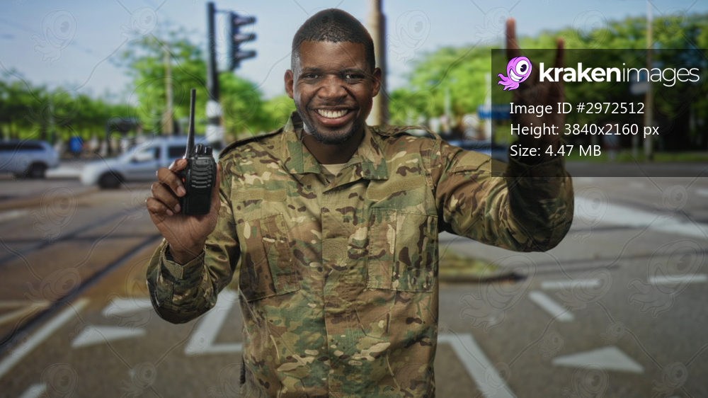 Soldier man in camouflage uniform smiles, holds a walkie talkie and flashes rock horns while standing at a busy street intersection; pride duty.