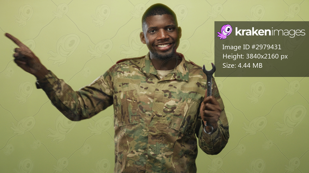 Soldier man in camouflage uniform smiling, holding a wrench and pointing finger left in studio; pride duty.