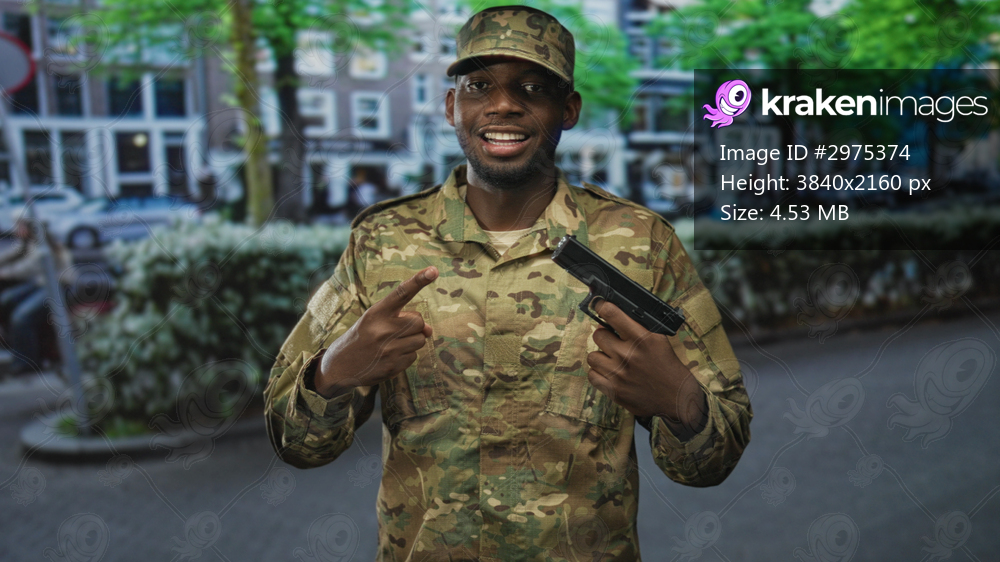 Soldier man pointing finger at a handgun on a street, smiling and holding the pistol while wearing camouflage uniform and cap; confidence readiness.