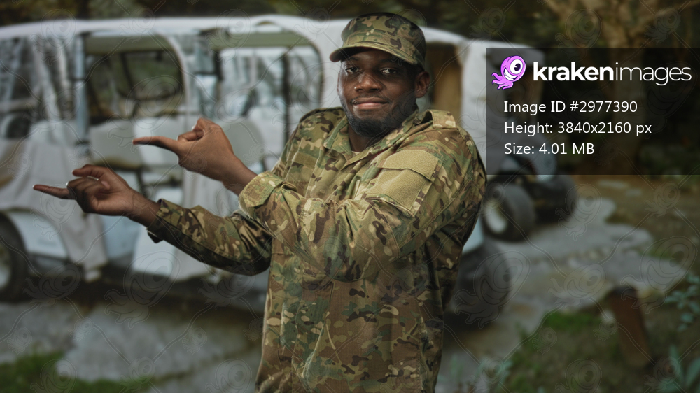 Soldier man points both fingers to the left toward a golf cart in forest, camo uniform and cap visible, smiling slightly; pride duty.