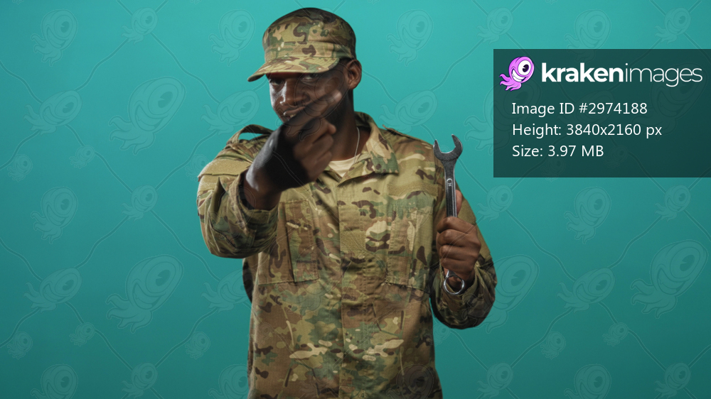 Soldier man points finger at camera while holding wrench in studio camo uniform and cap; confidence duty maintenance.
