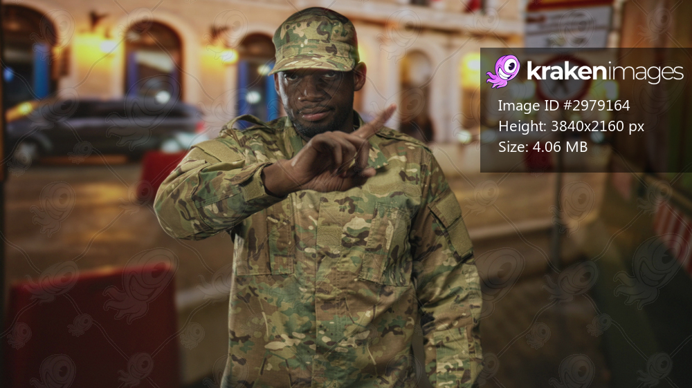 Soldier man points finger to camera on city street by lit building arches, visible finger and camo uniform; alert duty vigilance.