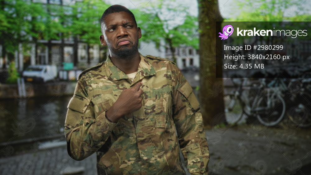 Soldier man points hand to chest on street by canal, wearing camouflage uniform, standing beside bicycles and a tree on a cobblestone path near water; pride duty. - Kraken Images