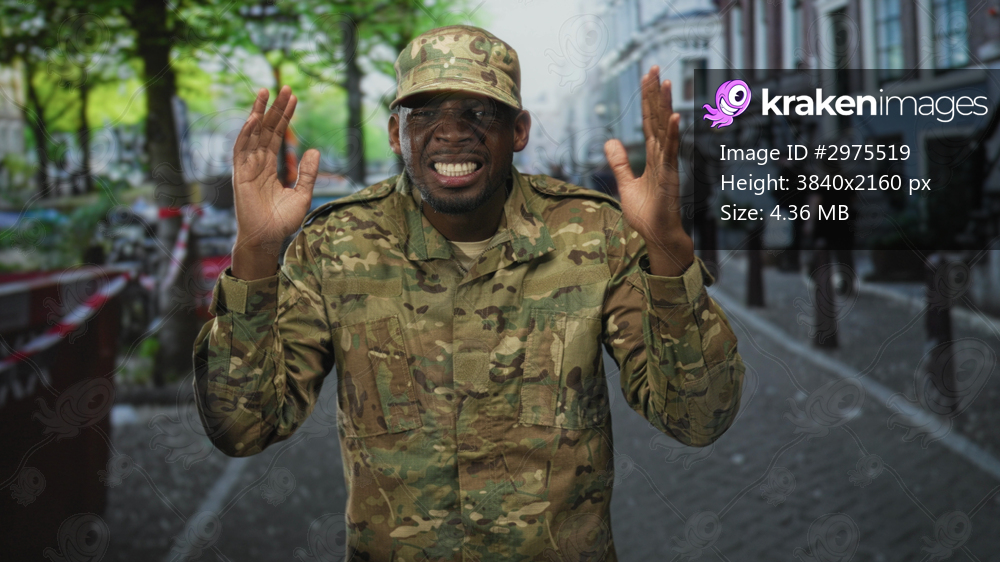 Soldier man raising hands shouting on street in camouflage uniform and cap with palms visible; defiance protest resilience.