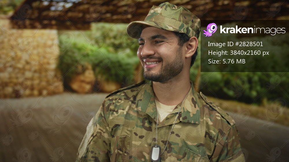 Soldier smiles broadly showing dogtag while standing under a wooden building structure outdoors; pride duty.