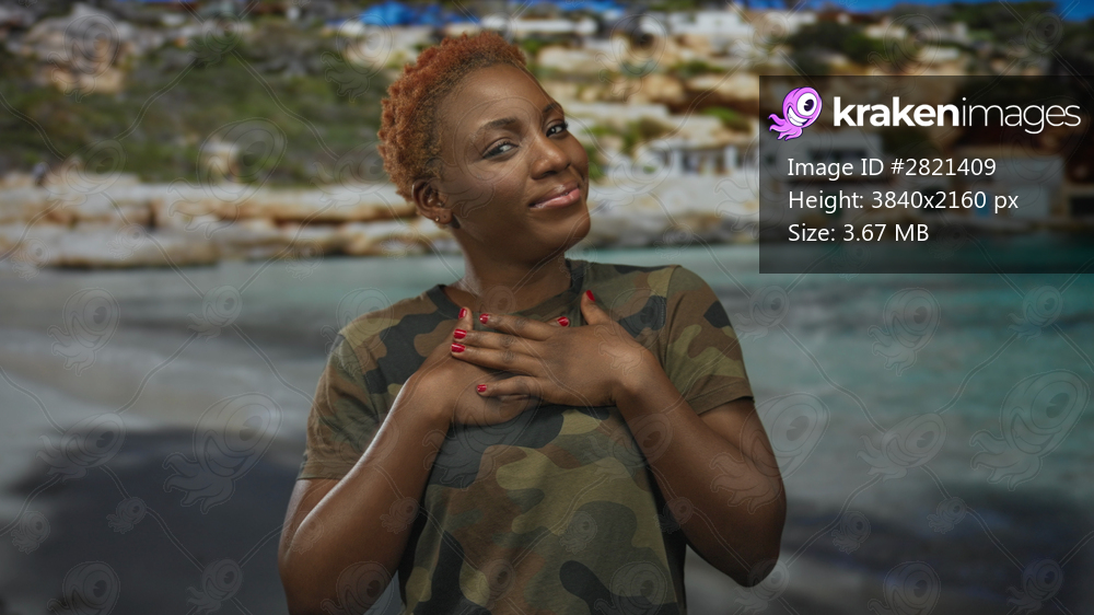 Soldier woman in camouflage uniform smiles with hand on chest on sandy beach by turquoise sea water; pride duty.
