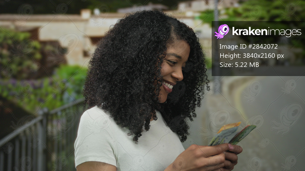 South african woman holds rand banknotes in both hands on a sunlit street with smiling gesture; happiness.