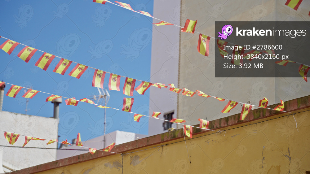 Spanish flags fluttering in the sunny outdoor breeze against a blue sky in spain with nearby buildings and satellite dishes in view, creating a vibrant festive atmosphere. - Kraken Images