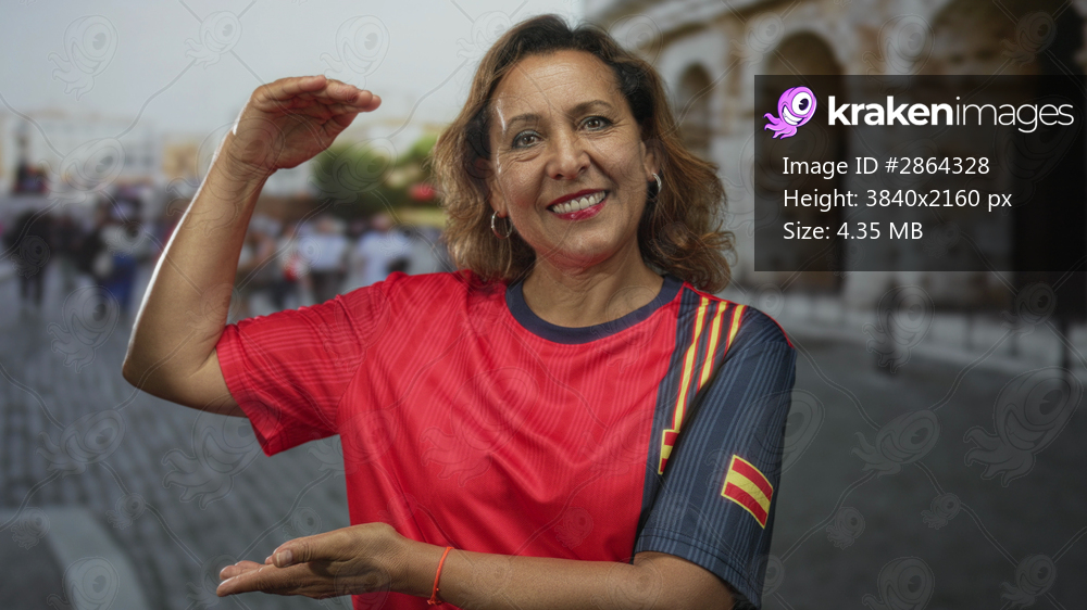 Spanish woman in red t shirt framing circle gesture with hands in front of ancient coliseum building during daylight; pride.