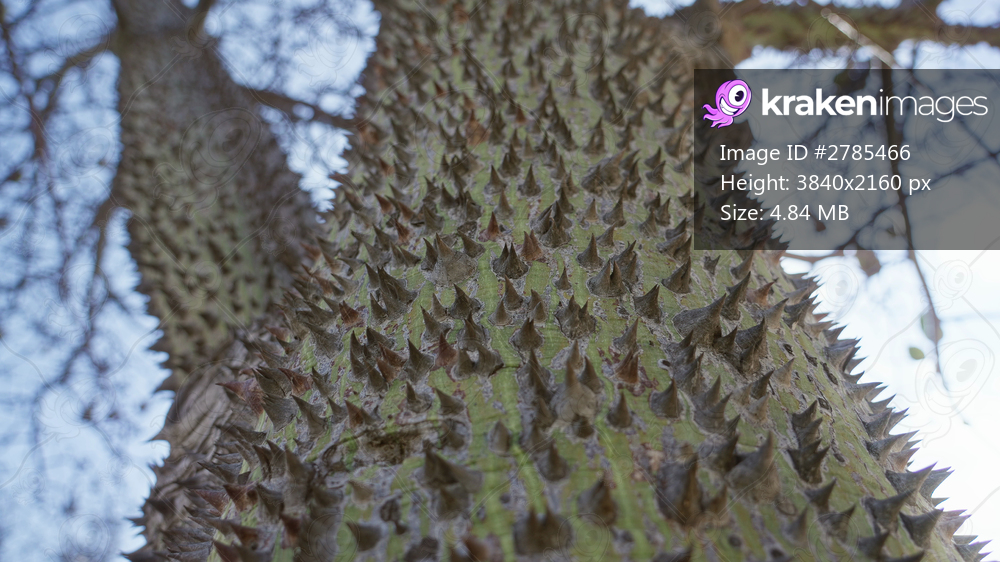 Spiny trunk of ceiba tree in torrevieja, spain, showcasing distinctive thorns against a sunny blue sky, highlighting the unique texture and natural outdoor setting. - Kraken Images