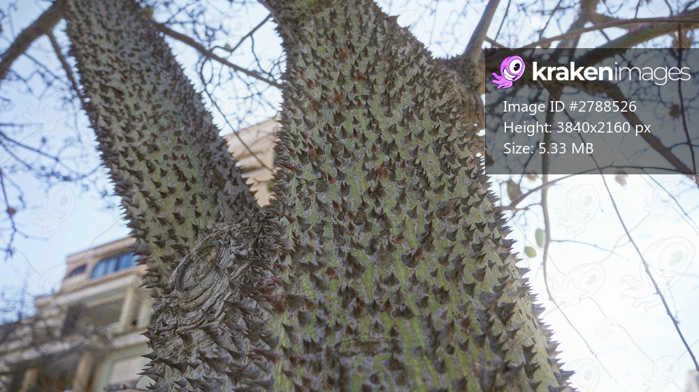 Spiny trunk of ceiba tree in torrevieja, spain, showcasing distinctive thorns against a sunny blue sky, highlighting the unique texture and natural outdoor setting. - Kraken Images