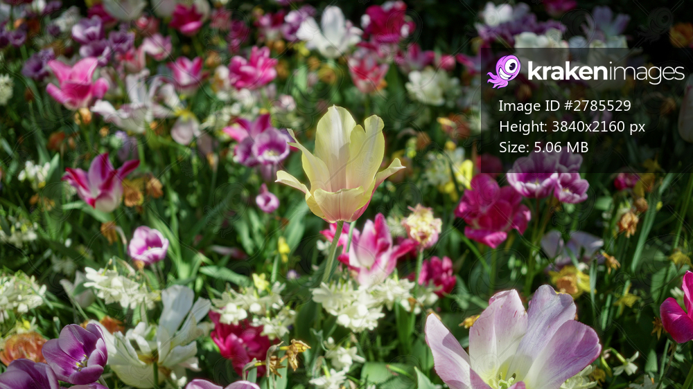 Spring flowers bloom vibrantly in a colorful garden in the netherlands, showcasing tulips and lush greenery under the warm sunlight.