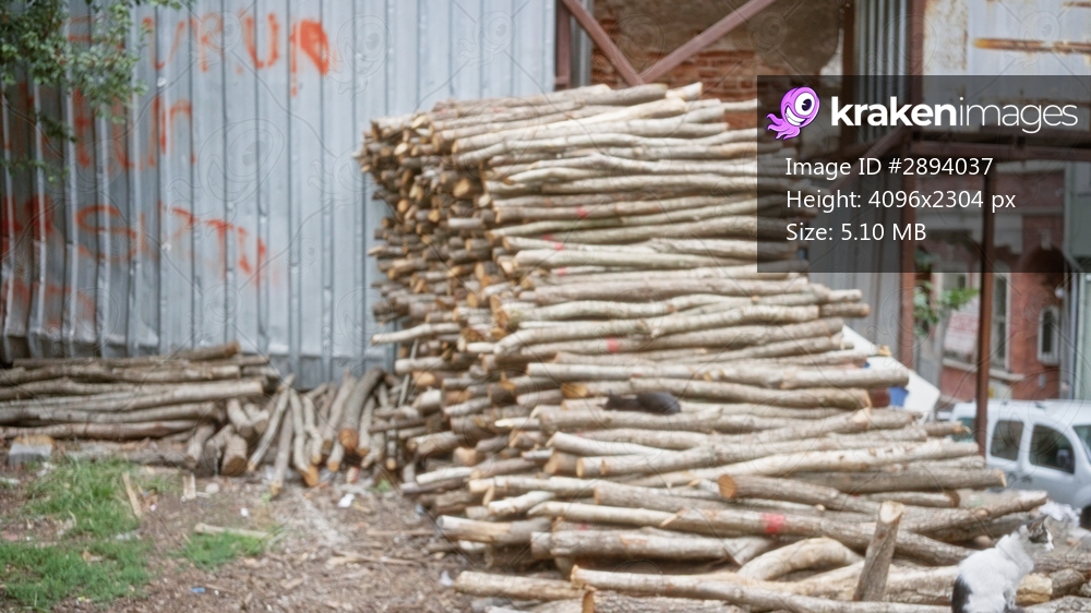 Stacked logs and timber pile with shallow defocused background and corrugated metal fence in an outdoor city yard; backdrop copyspace backplate for rustic urban designs. - Kraken Images