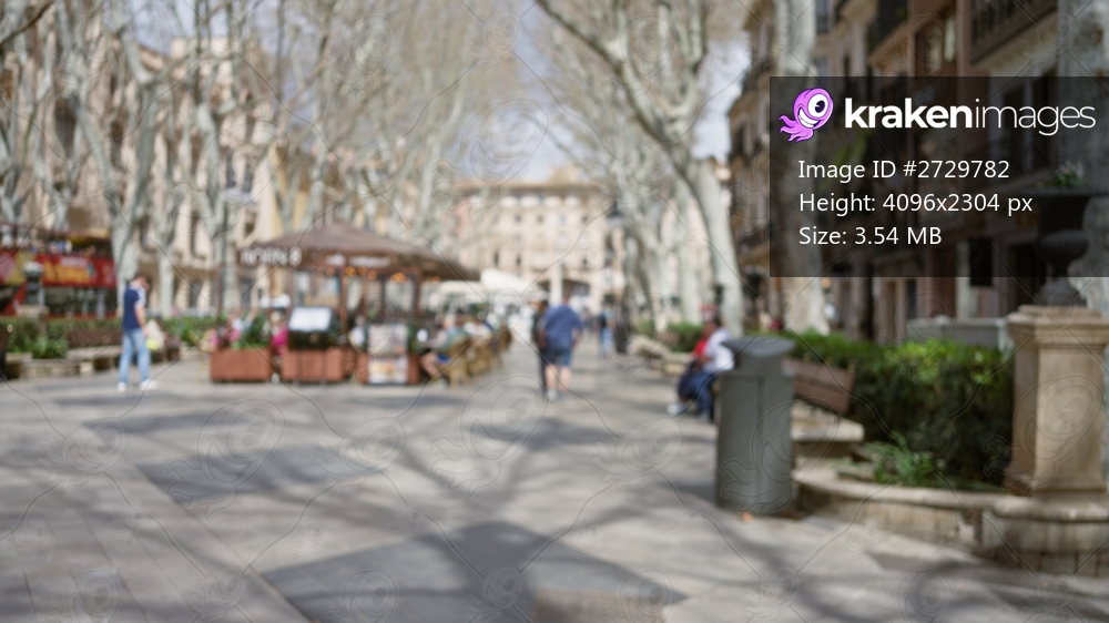 Street scene with blurred pedestrians and outdoor cafe in a european town, creating a defocused, bokeh effect with trees and city architecture in the background. - Kraken Images
