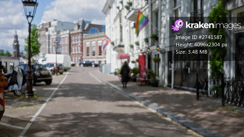 Street scene in amsterdam features woman walking past bokeh buildings with flags and parked cars under sunny sky with vibrant atmosphere.