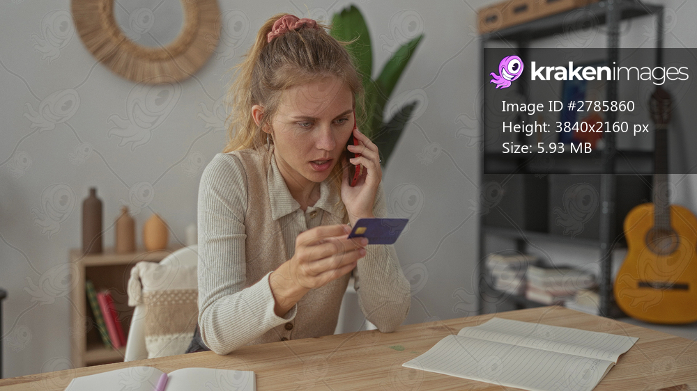 Stressed woman on phone talking at home, blonde young adult clutches credit card beside desk notebook open.