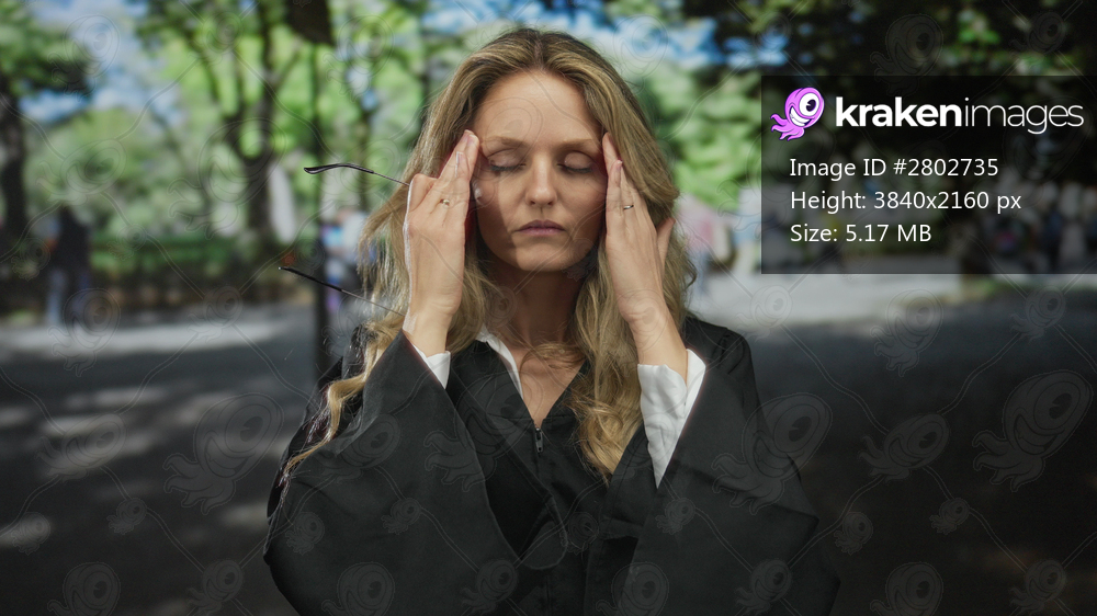Stressed woman pressed temples before rubbing in park while a young blonde judge in uniform paused outdoors beneath green foliage.