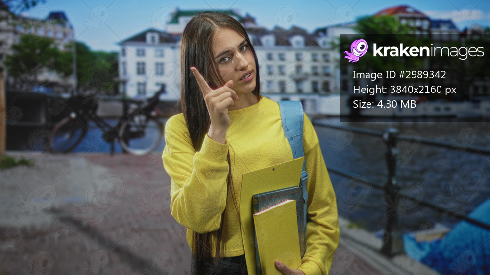 Student girl holding notebooks and backpack, finger to temple while standing on a canal street with buildings and bike; curious pondering.