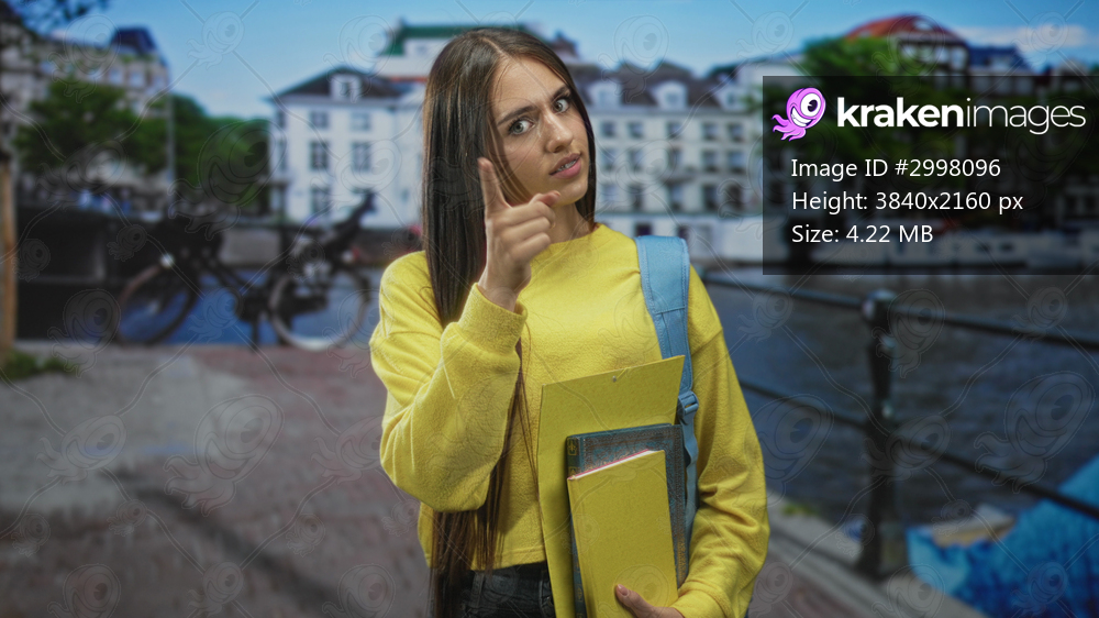 Student girl holding notebooks and backpack, finger to temple while standing on a canal street with buildings and bike; curious pondering.