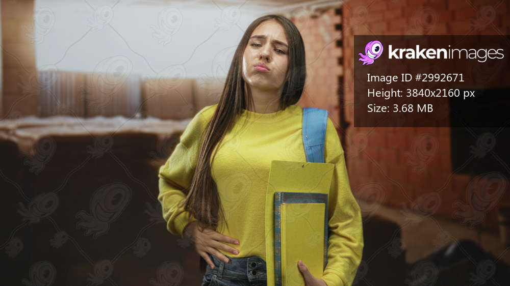 Student girl holding yellow folder and book, blue backpack strap visible, hand on stomach for nausea inside a building; discomfort.