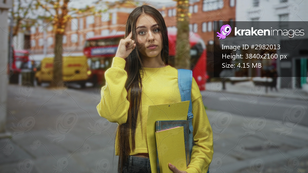 Student girl holding yellow notebooks and backpack points finger to temple then points forward on a street with buses and shops; confident focus.