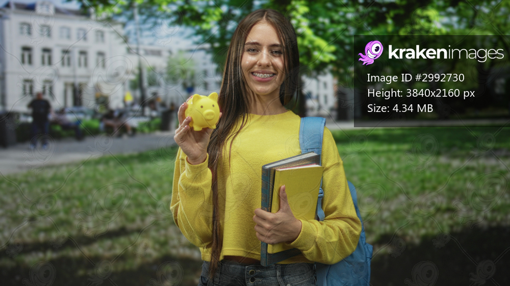Student girl holds yellow piggybank and textbooks with hand extended toward camera in front of building; hopeful saving.