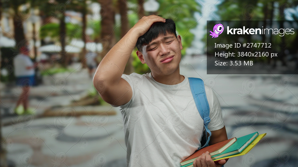 Student holding notebooks in city street looks puzzled with hand on head, wearing casual white shirt and blue backpack amid urban backdrop.