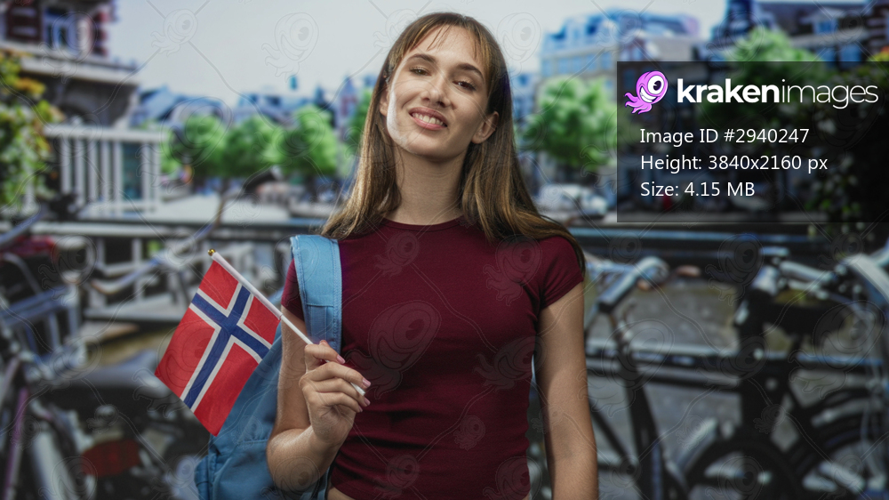 Student woman holding norwegian flag with her hand on a street bridge in amsterdam; pride travel youth.