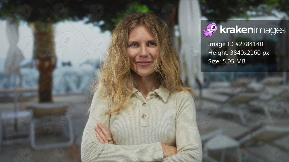 Stylish woman folds arms while smiling on a beach next to a blonde young host near a resort vacation outdoor umbrella area.