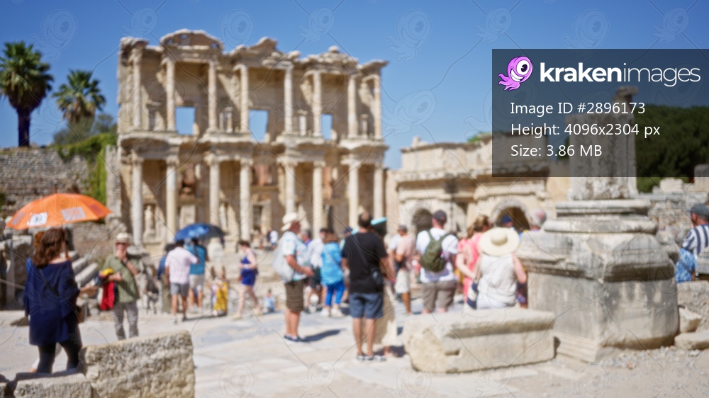 Sunlit ancient stone ruins shown in soft defocused bokeh with weathered columns and carved facade, outdoor plaza; background copyspace backplate.