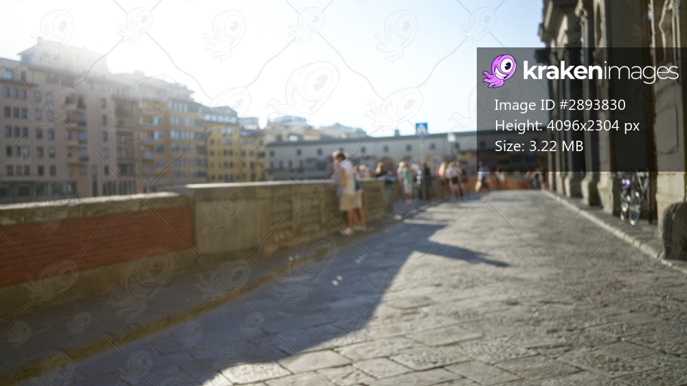 Sunlit defocused cobblestone city street with stone balustrade and blurred historic facades; background backplate copyspace calm.