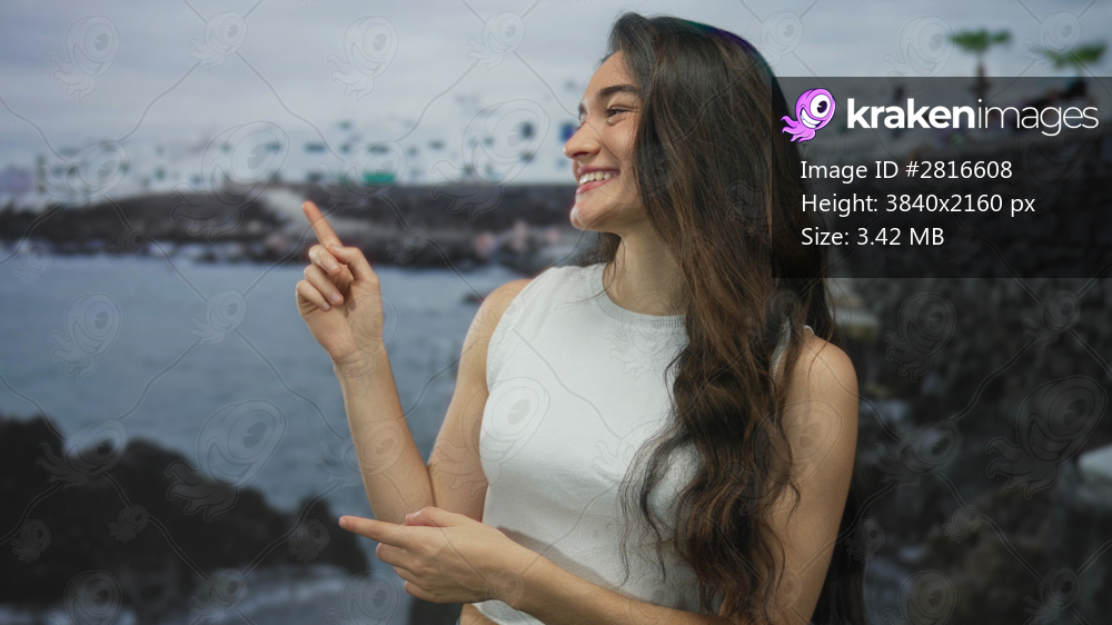 Sunlit hispanic woman wearing a white tank top points finger at white building beside rocky seaside wall; playful joy.
